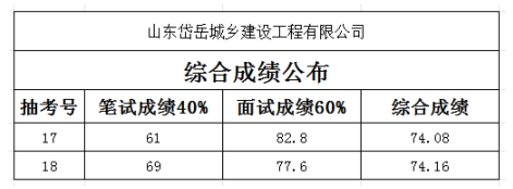 山東岱岳城鄉(xiāng)建設(shè)工程有限公司因工作需要,委托山東前程似錦人力資源有限公司公開招聘工作人員,現(xiàn)筆試、面試工作已結(jié)束,依據(jù)《山東岱岳城鄉(xiāng)建設(shè)工程有限公司招聘公告》,現(xiàn)對(duì)本次公開招聘各崗位應(yīng)聘者綜合成績予以公示。